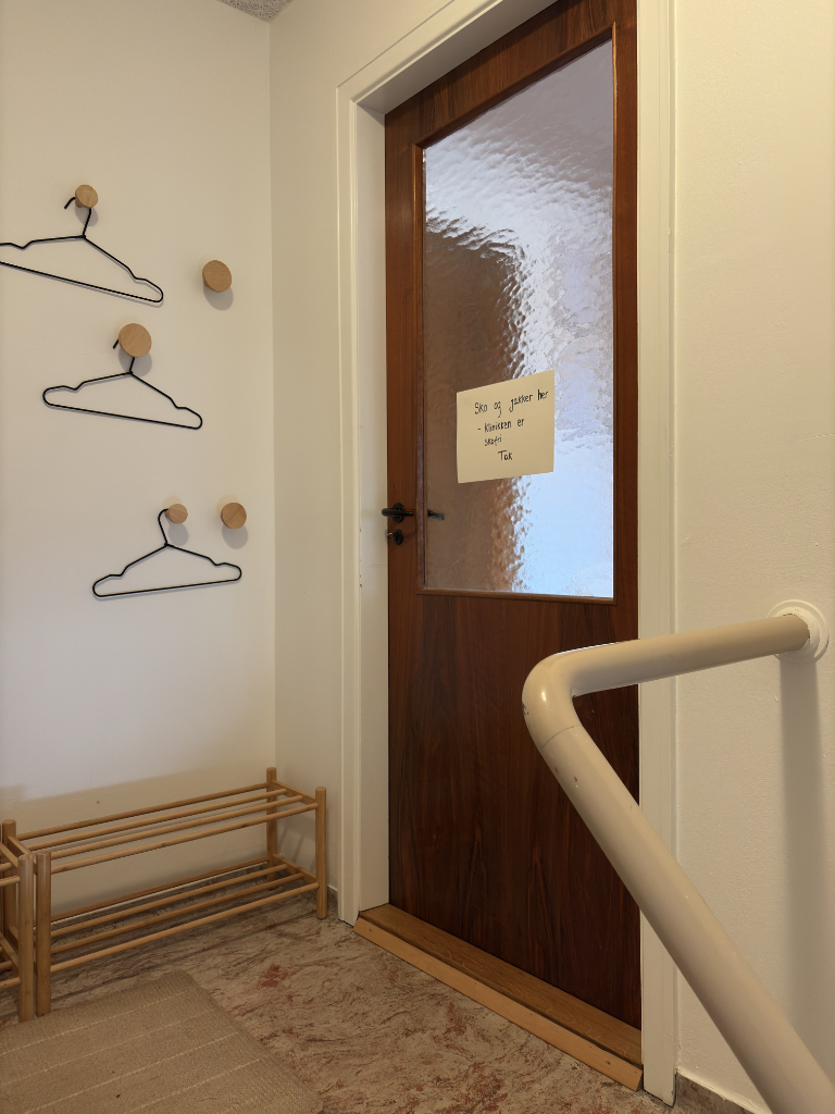 Klinikken er sko og jakkefri, så du bedes tage overtøjet af, når du er kommet op ad trappen, inden du kommer ind i selve klinikken. Der er bøjler og skohylder til dine ting, og har du et par inde/hjemmesko du gerne vil have på, er du selvfølgelig meget velkommen til det. Du er meget velkommen til at benytte et af de to toiletter.
